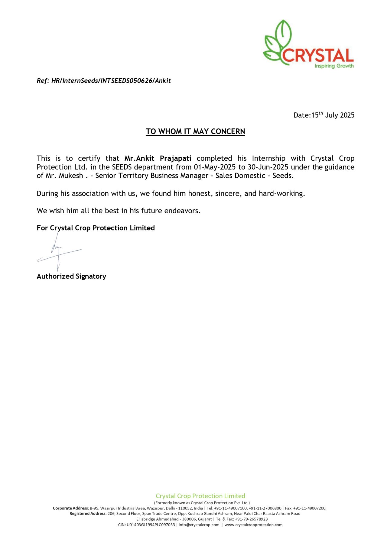Summer Intern at Crystal Crop Protection Limited || PGDM-ABM (2024-26) at URICM, Gandhinagar, Gujarat | B.Tech (Agricultural Engineering) at Dr. A. P. J. Abdul Kalam Technical University, Lucknow, Uttar Pradesh
